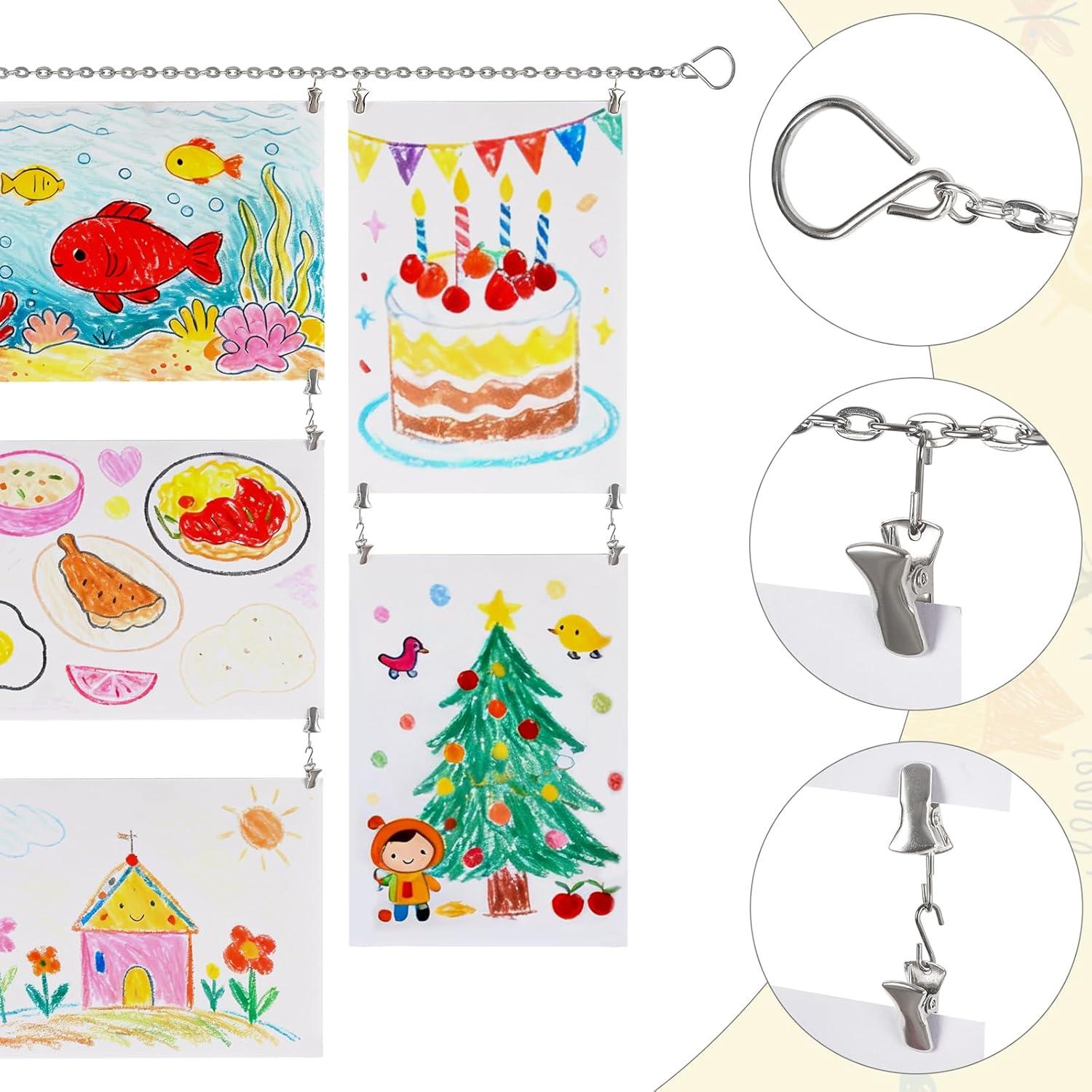 Durability and Adaptability: Constructed from high-quality chain material and sturdy metal clips, the art display holder is designed for long-term use. It is suitable for a wide range of environments, including children's rooms, bedrooms, living rooms, and classrooms, etc.. Regardless of the interior décor—be it modern, minimalist, boho, or playful—the art hanger integrates seamlessly, complementing the overall design scheme.