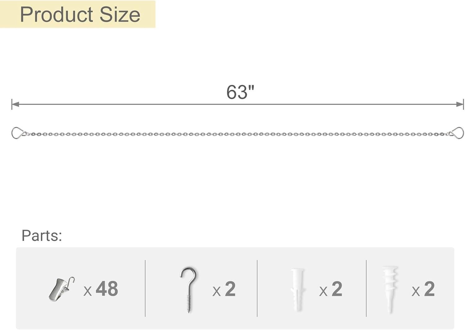 Size and Package: The overall length of the art display measures 63 inches. The package comes with everything you need: 1 chain hanger, 48 metal hook clips, and dedicated installation accessories. Follow the simple steps, and you can quickly install the art display by following the instruction.