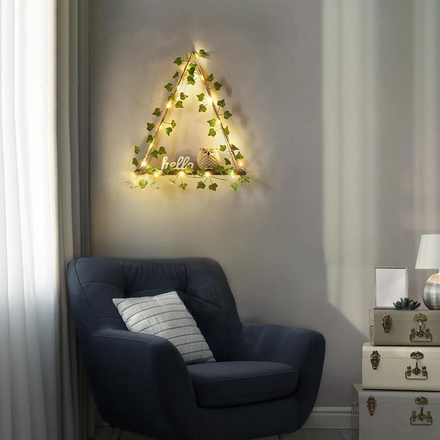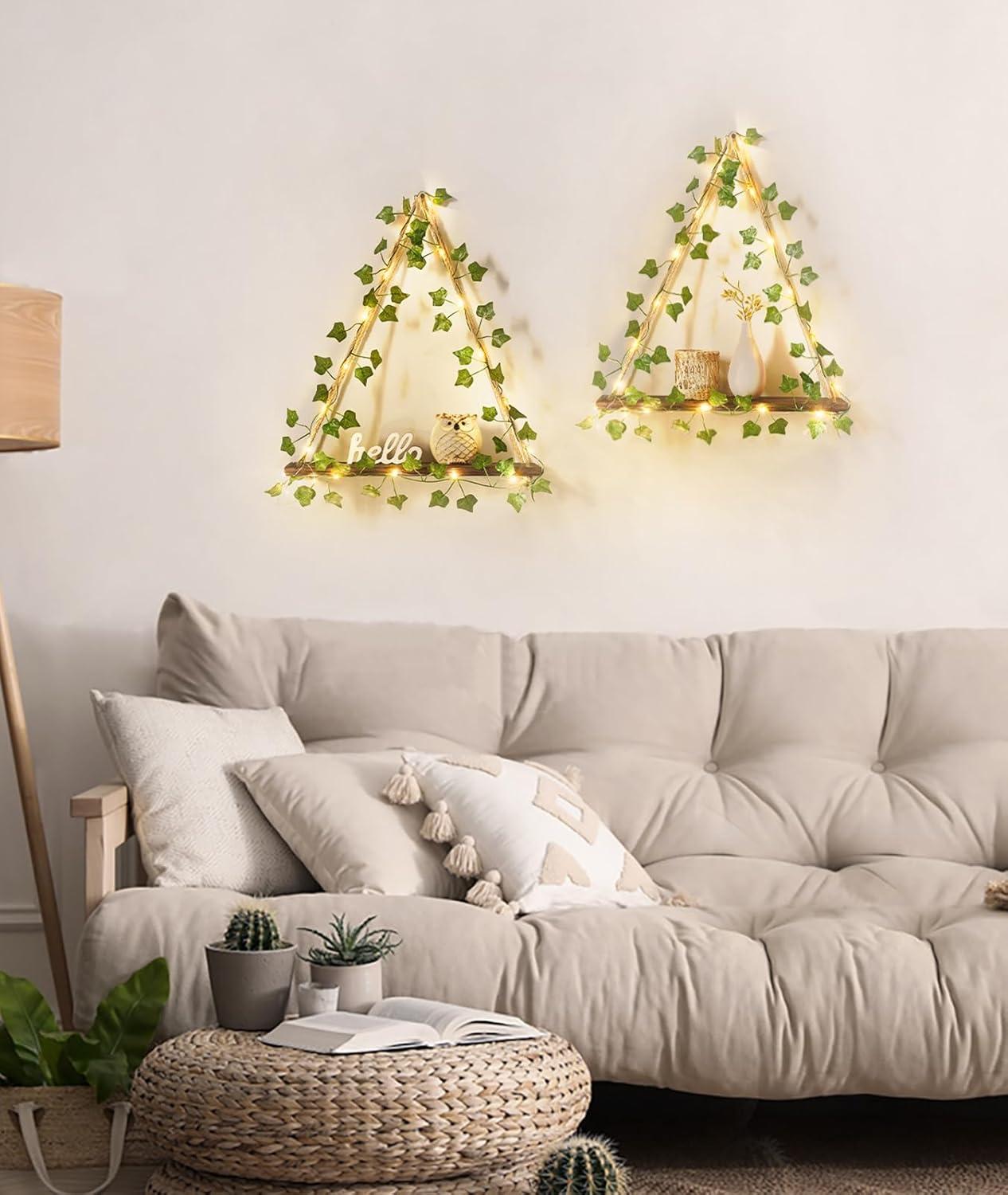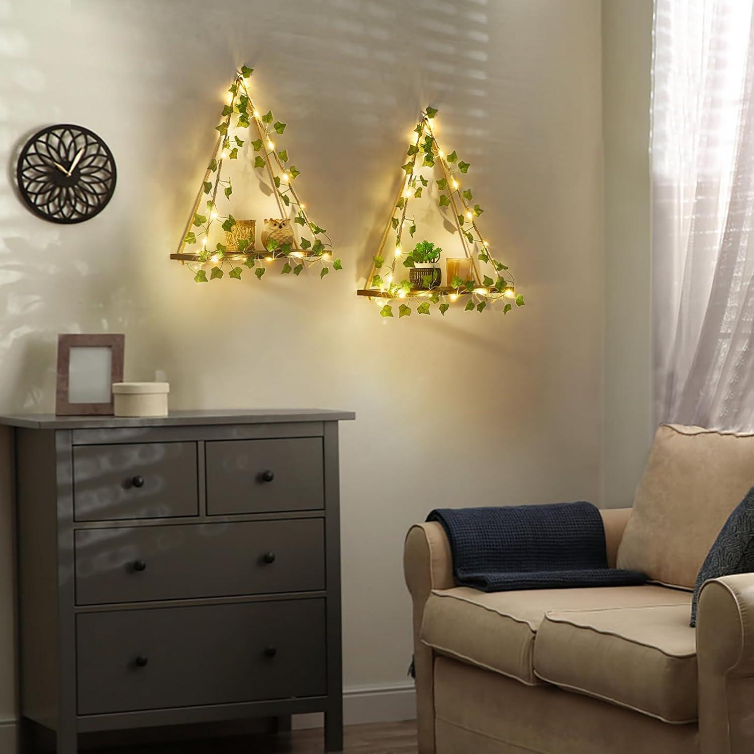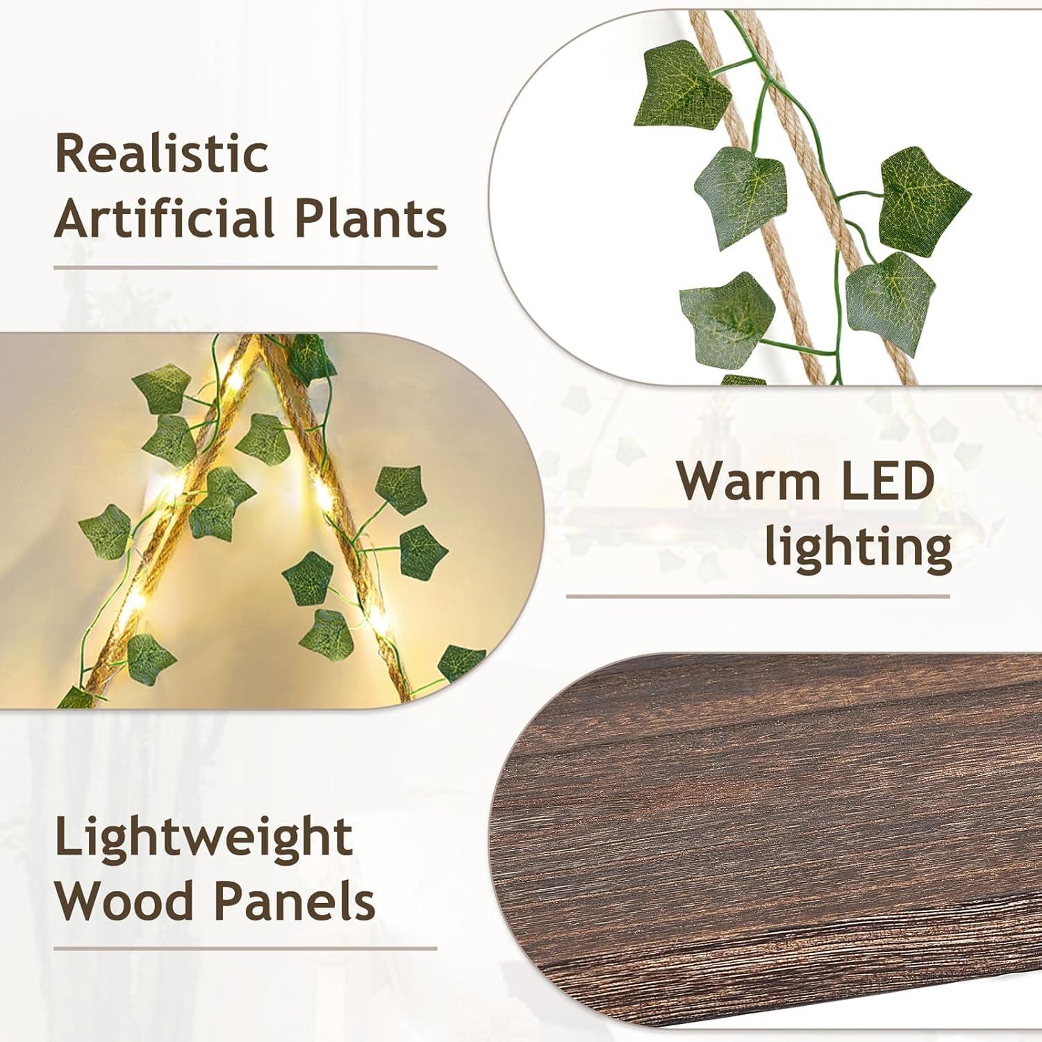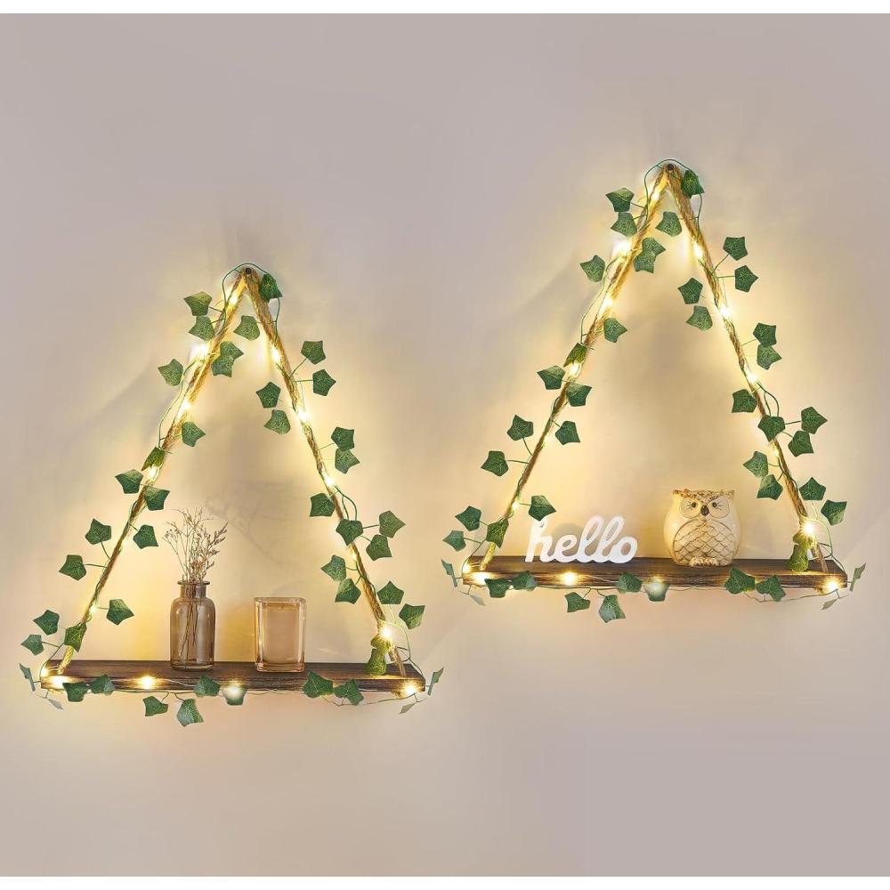 Greenery & Comforting LED Atmosphere: This floating shelves combines with artificial greenery with LED lights, a natural look that not only better showcases plants but also easily bring a sense of vintage and warm style to your homey area (Note: Batteries are not included)
