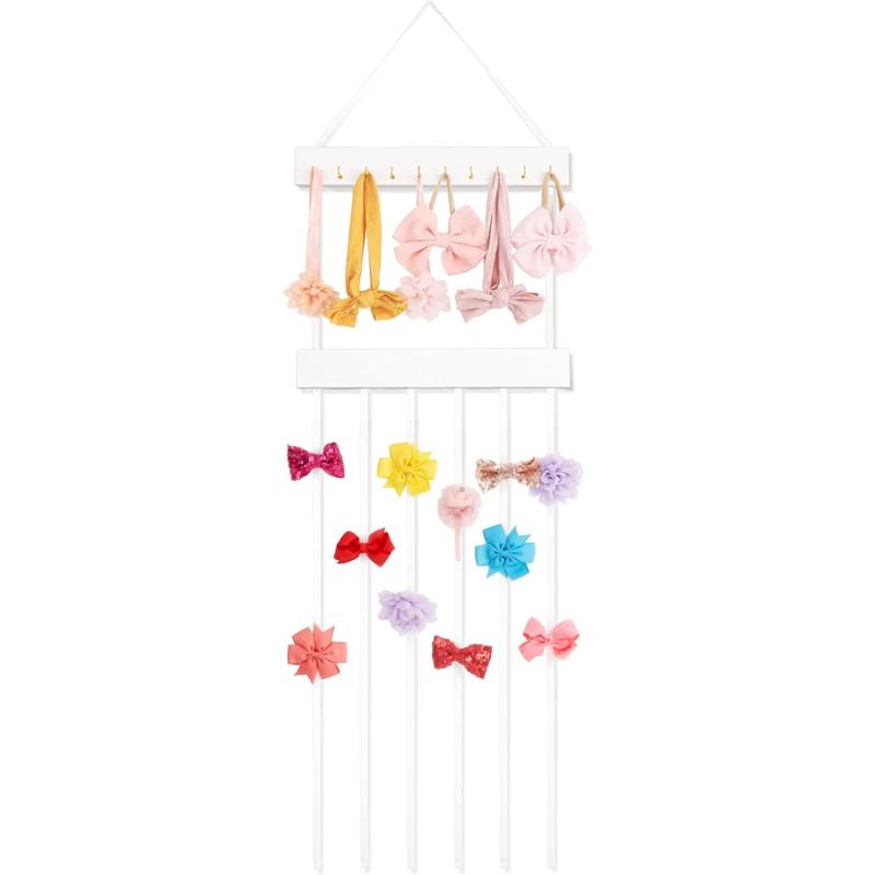 Large capability -meet all hair accessories storage needs: 2-tiers hanging bow and clip holder is suitable for a various of headwears. The upper wooden board has 10 metal hooks, which can perfectly store hair bows, headbands, scrunchies, ties, belt. White long ribbons is great for storing hair clips. Make kid’s room orderly and beautiful.