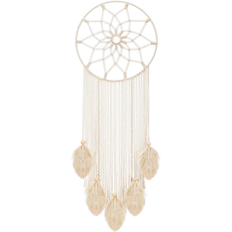 Materials: Cotton, metal ring and wooden beads. Unique designed and handcrafted, this unique piece will be sure to be the center of attention wherever you choose to hang it.