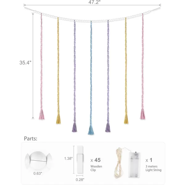 The wall art, which has a chic outlook, uses a high quality string threaded through beads as a chain, with each vertical strand woven from macrame. It comes with 45pcs removable wood clips, so you can display photos or artwork in different sizes on the string as you like. And the string lights are as soft as copper wire, so you are free to wind the shapes of the string lights into the macrame as you like.