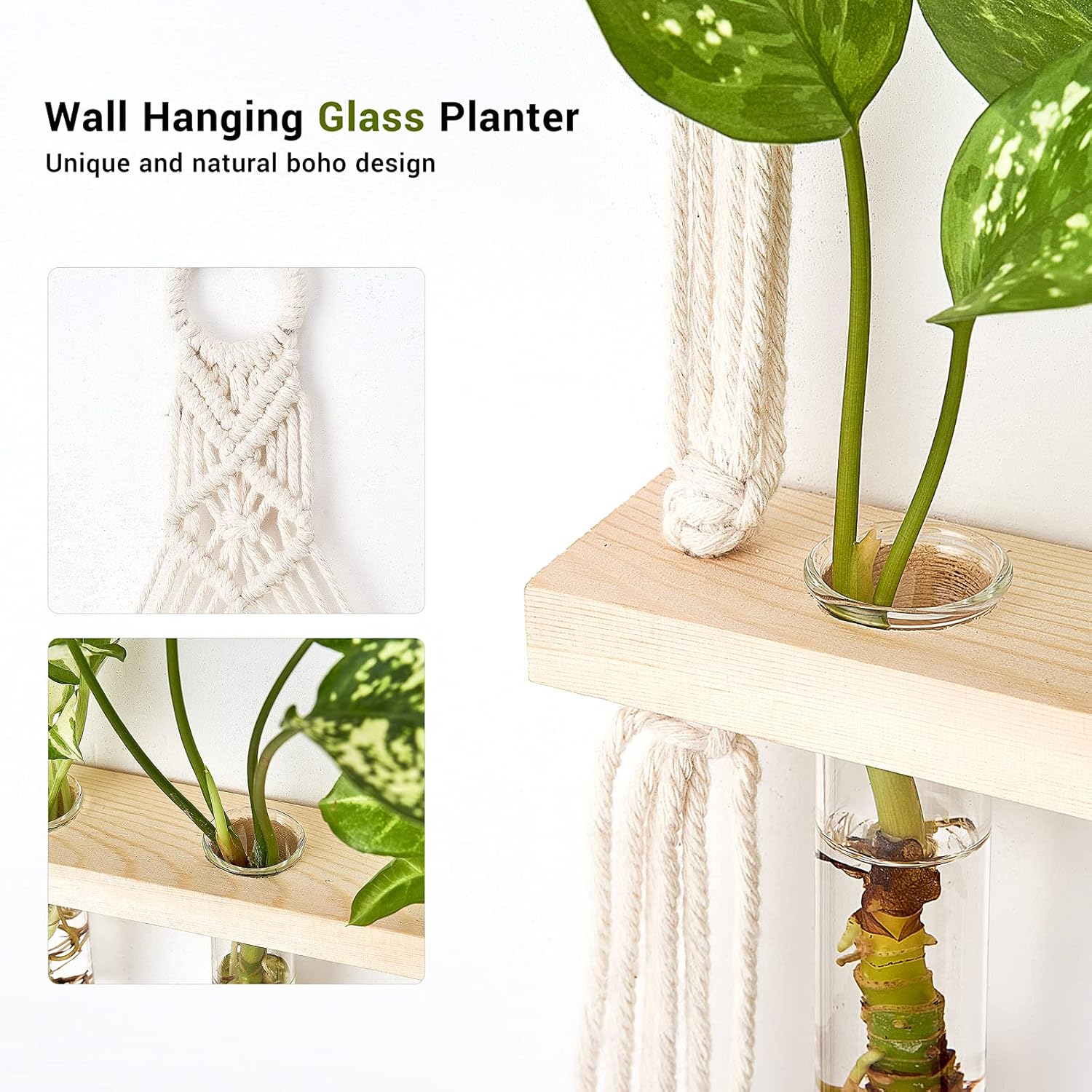 Made of natural wood and high boron silicon heat resistant glass. Package Include: 1 x macrame wooden stand, 16 x 4.3'' test tubes, 1 x cleaning brush, 1x hook, 2 x expanded tubes, 2 x seamless nails.Mkono is a registered trademark and our product is professional manufacturing and sole selling.