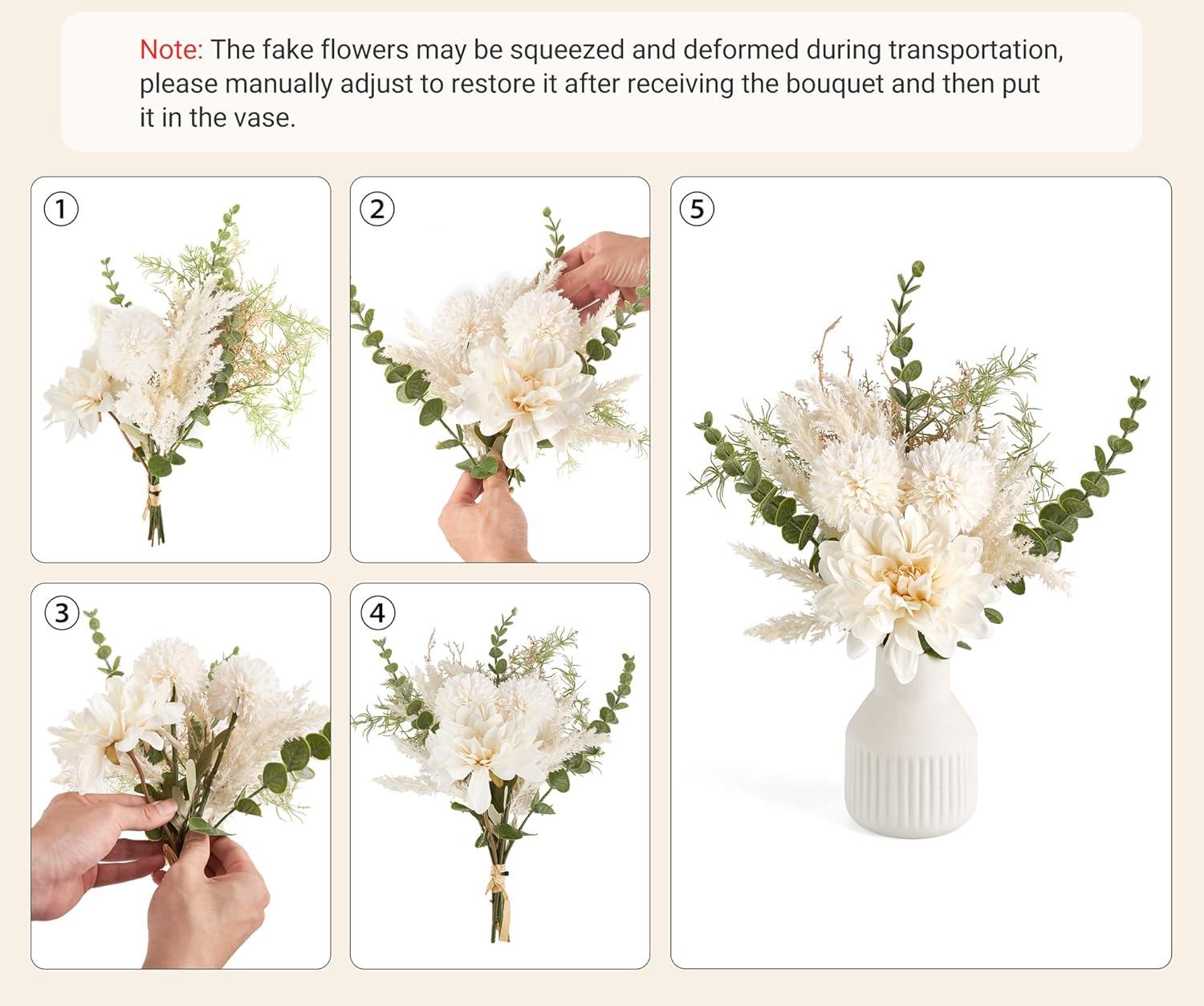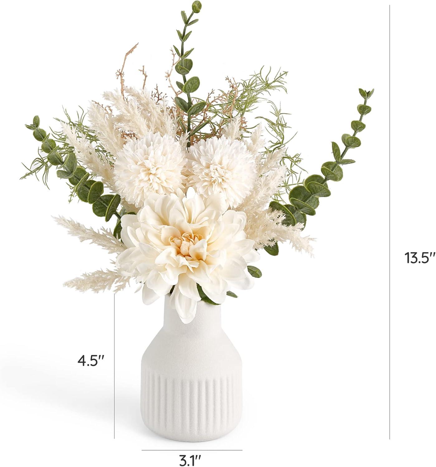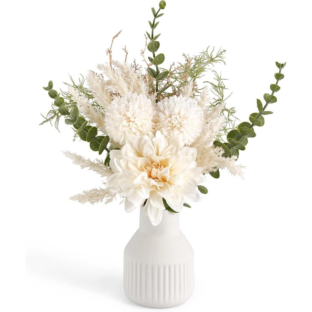 Small Faux Flowers in Vase: The artificial flowers for decoration include fake dahlia, dandelion, eucalyptus plants, and a matte white ceramic vase with vertical stripe. Putting the fake flower bouquet in the vase will create a poetic atmosphere, suitable for table centerpieces, coffee table decor, farmhouse decor, living room decorations