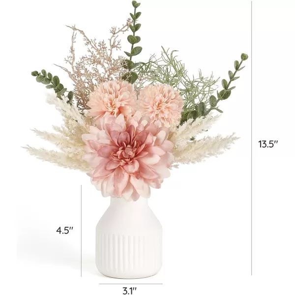 Small Faux Flowers in Vase: The artificial flowers for decoration include fake dahlia, dandelion, eucalyptus plants, and a matte white ceramic vase with vertical stripe. Putting the fake flower bouquet in the vase will create a poetic atmosphere, suitable for table centerpieces, coffee table decor, farmhouse decor, living room decorations.