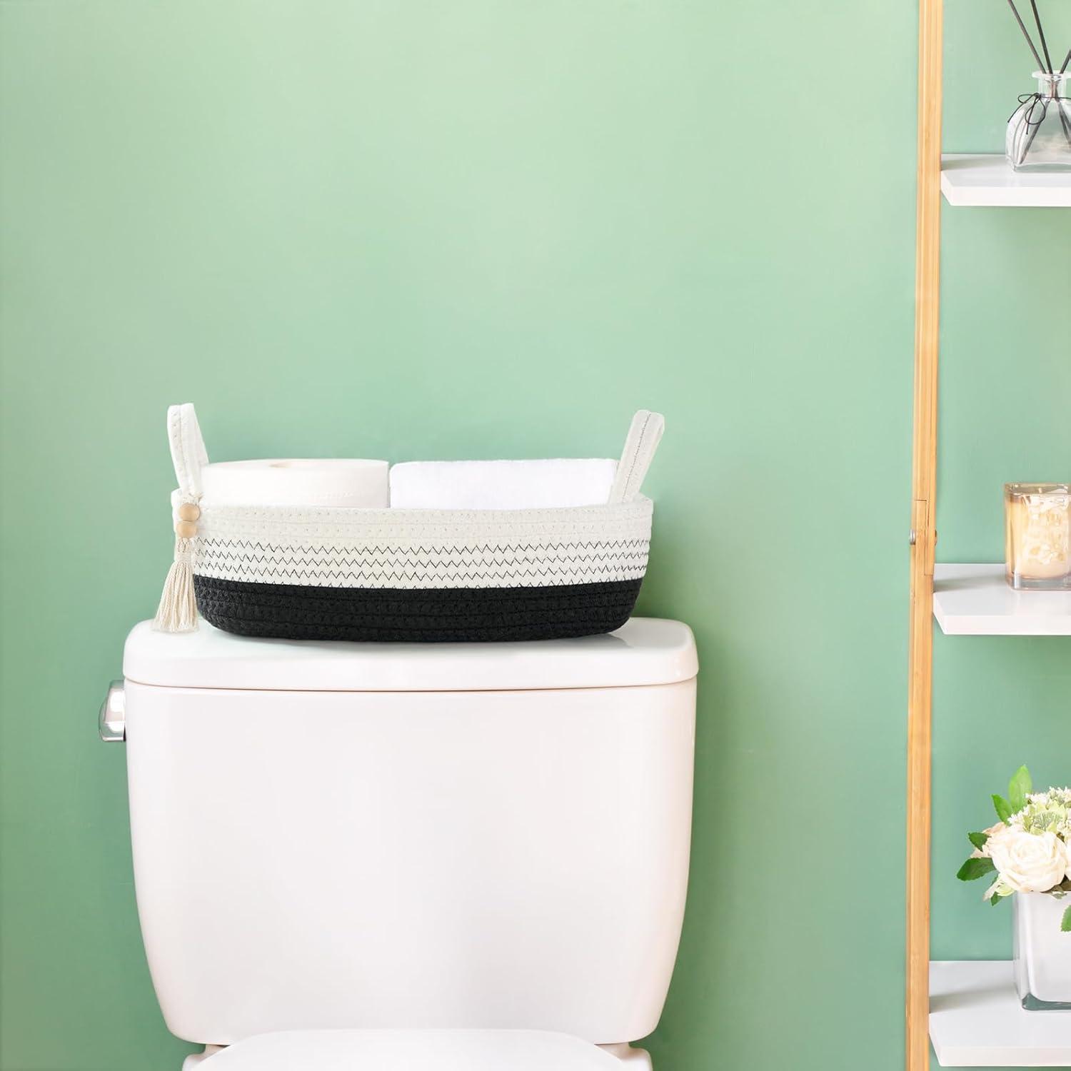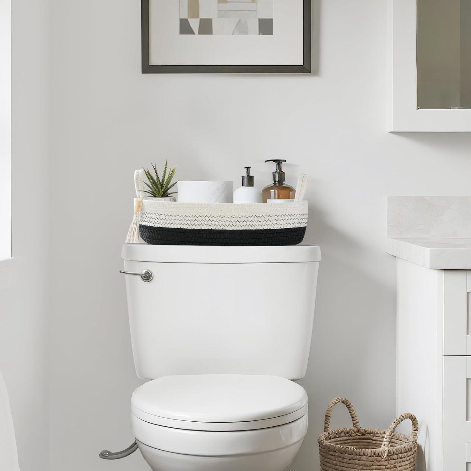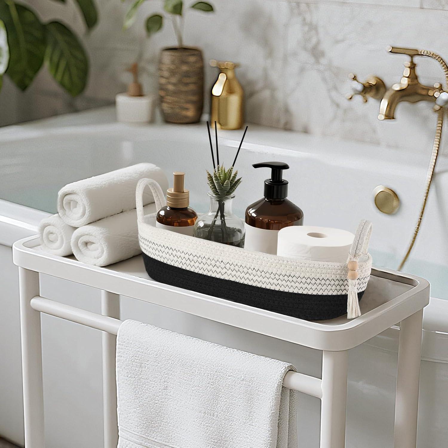 Mkono Small Storage Basket for Toilet Tank Top Boho Bathroom Decor Woven Rope Toilet Paper Tray Organizer for Shelf Bedroom Living Room, White and Brown, 13" L x 6" W(Black and White)