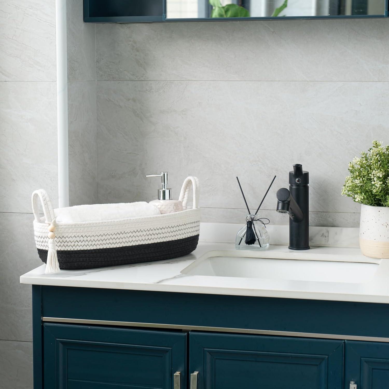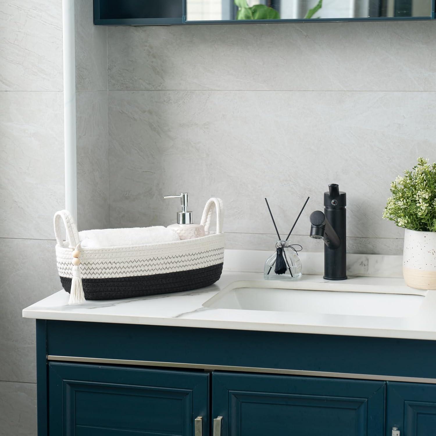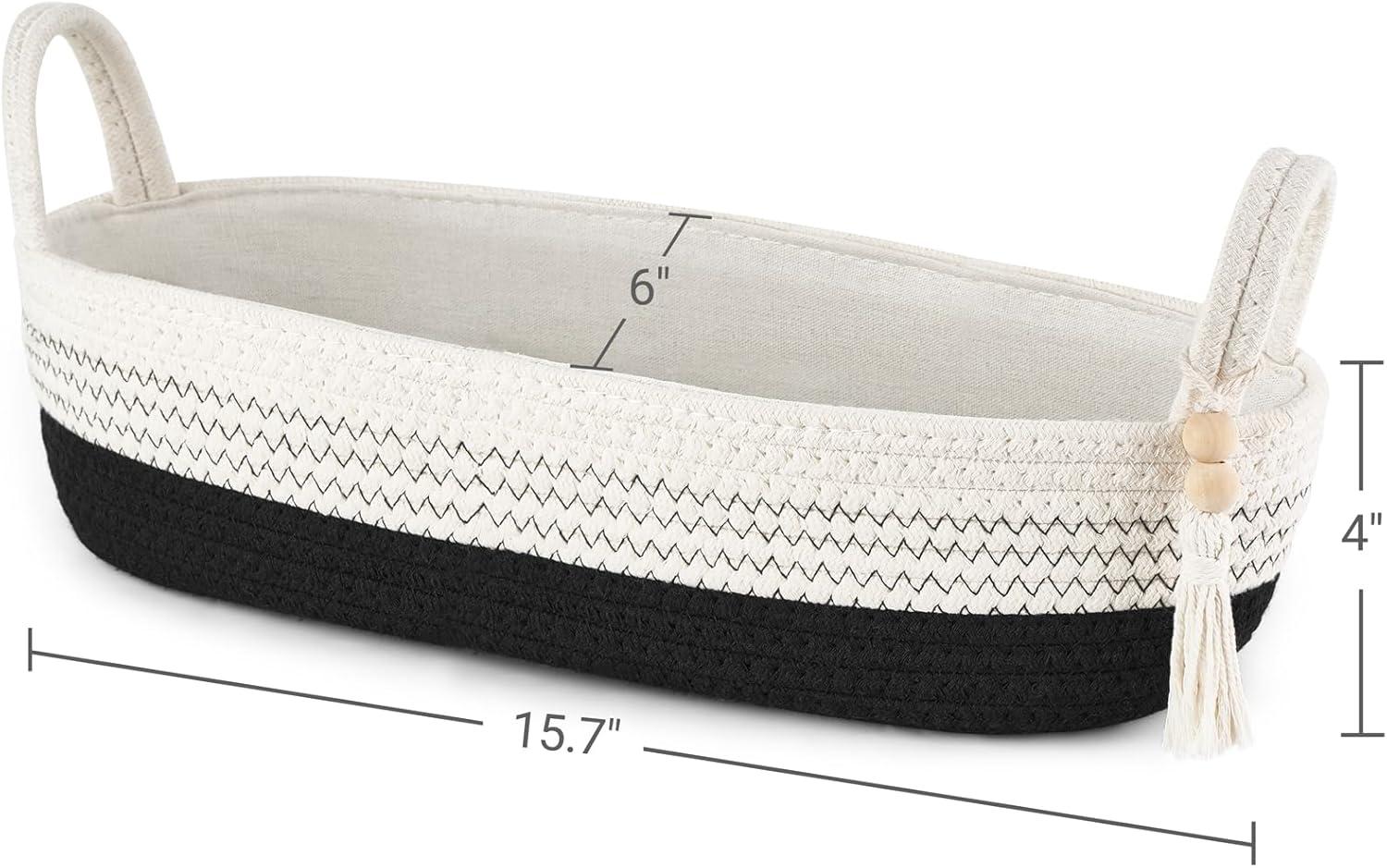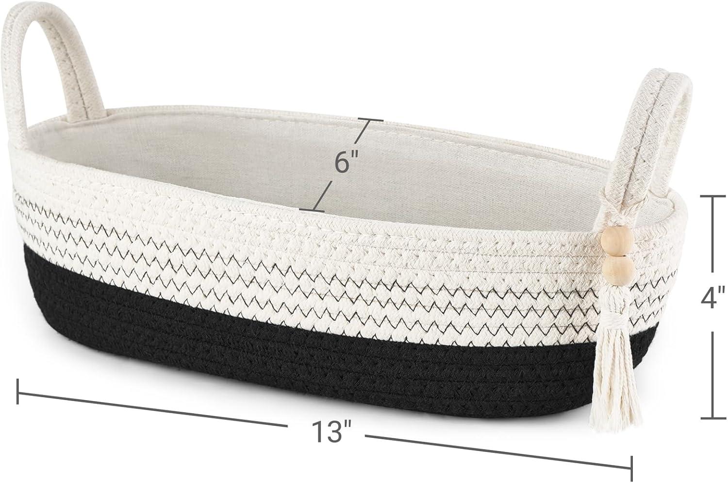 Mkono Small Storage Basket for Toilet Tank Top Boho Bathroom Decor Woven Rope Toilet Paper Tray Organizer for Shelf Bedroom Living Room, White and Brown, 13" L x 6" W(Black and White)