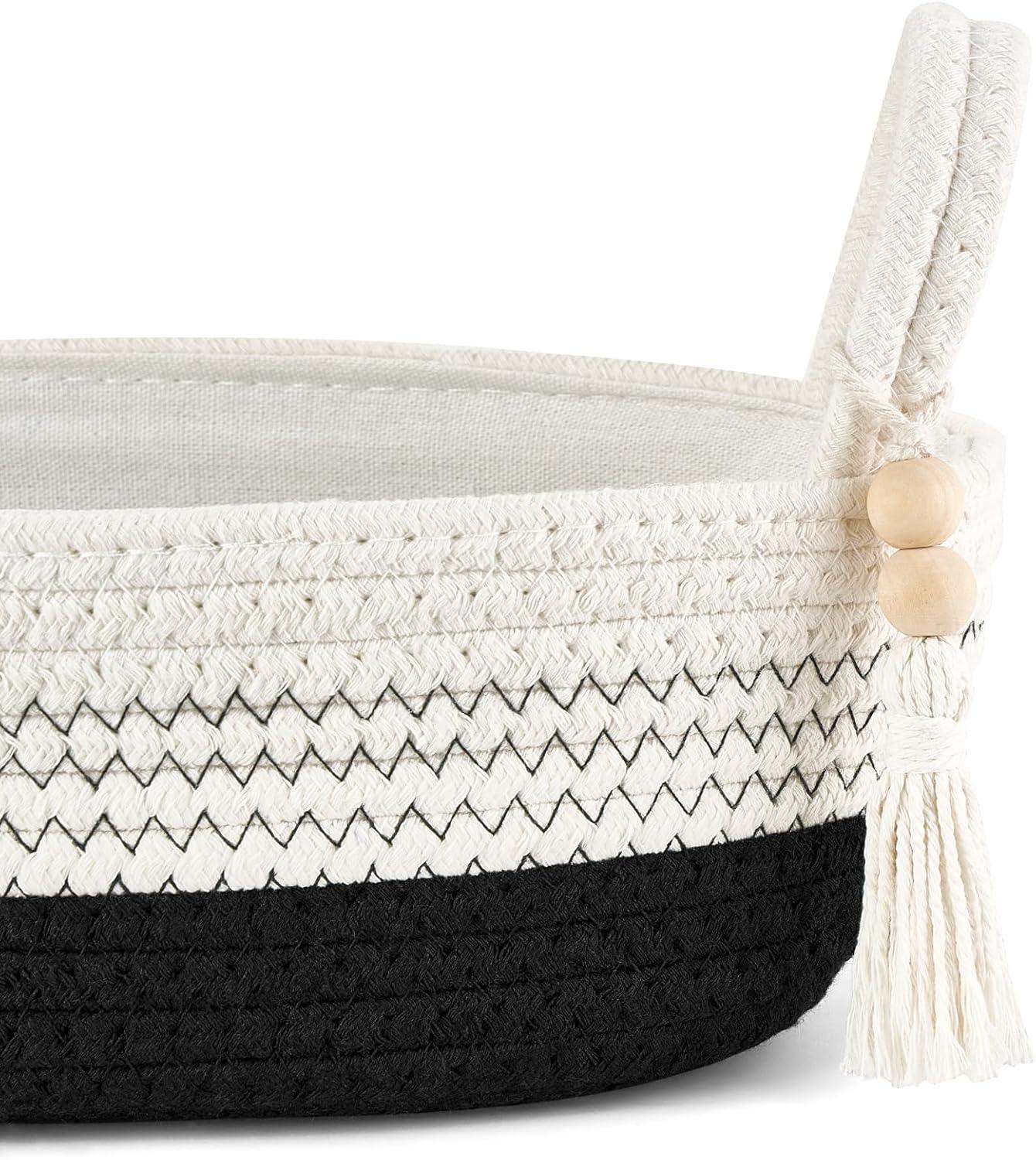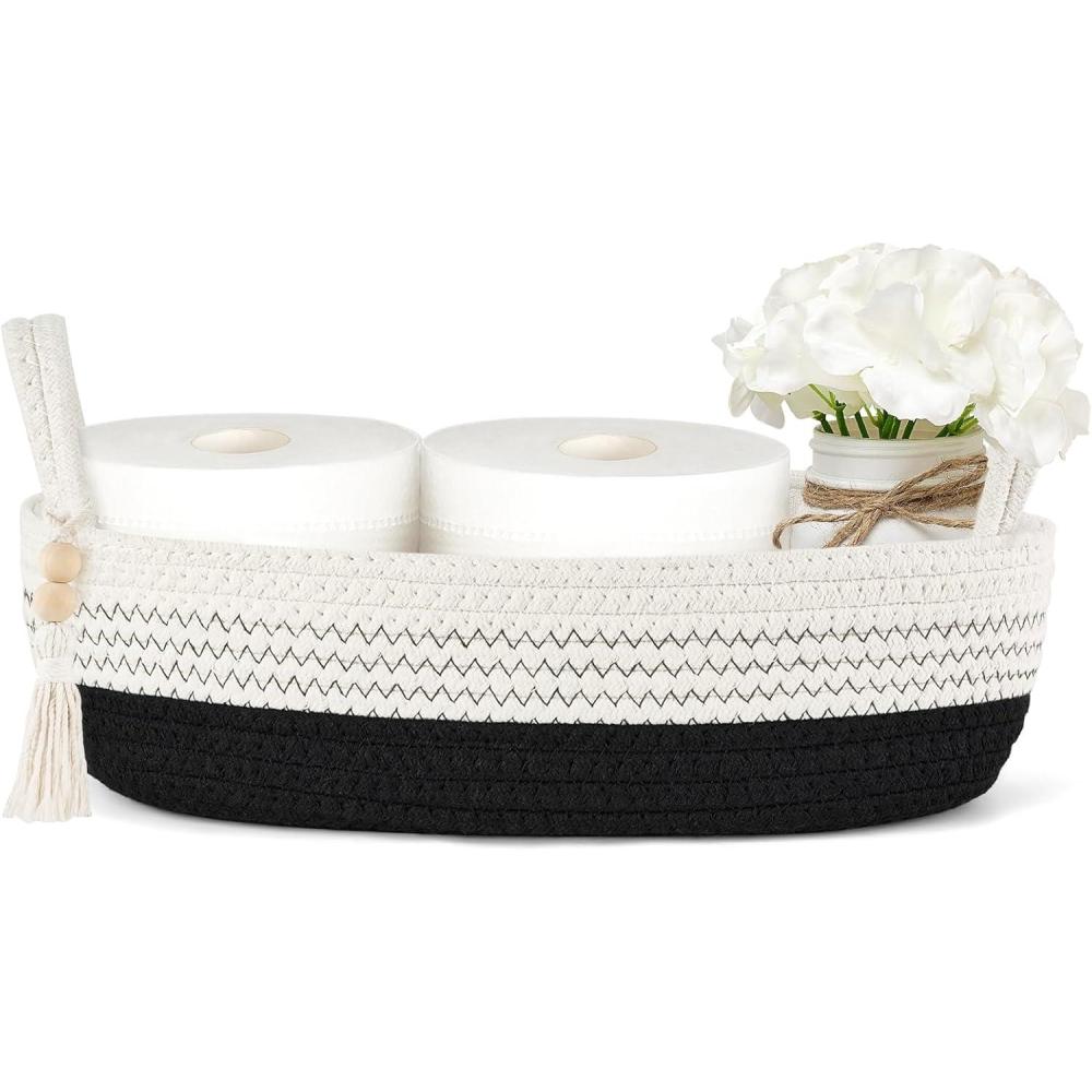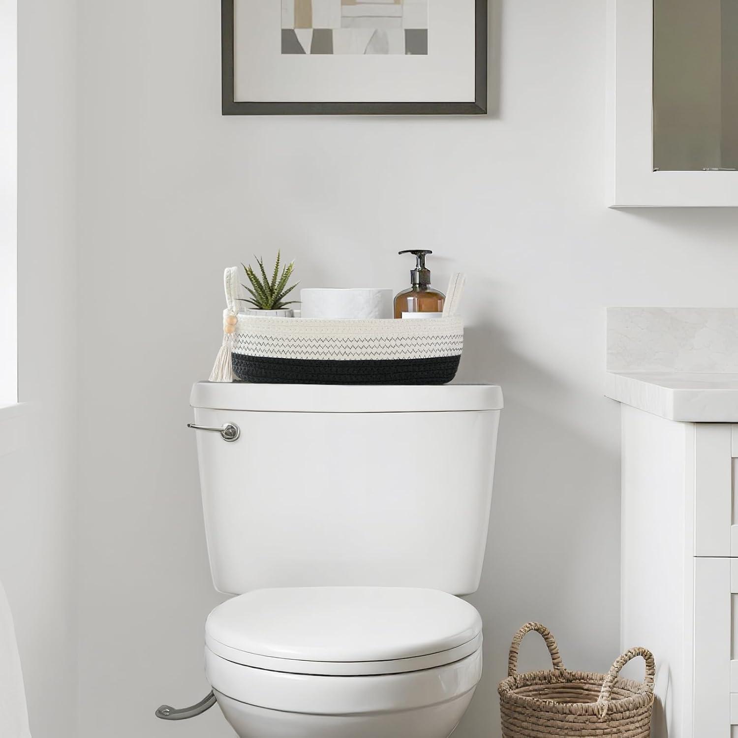 imageMkono Small Storage Basket for Toilet Tank Top Boho Bathroom Decor Woven Rope Toilet Paper Tray Organizer for Shelf Bedroom Living Room White and Brown 13quot L x 6quot WBlack and White