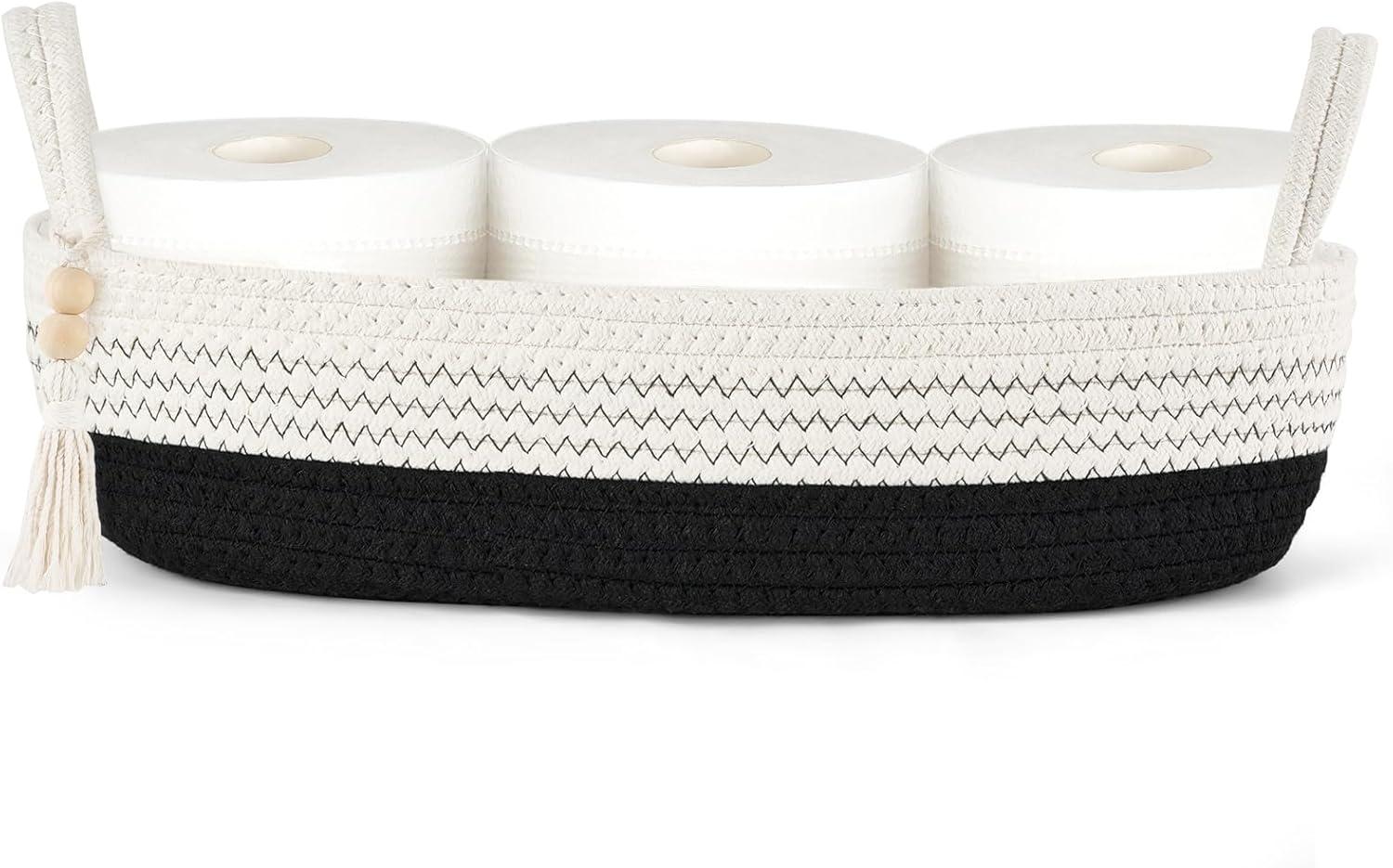 Our black and white bathroom accessories organizer is perfectly designed to hold toilet paper, personal care in the bath, or office essentials, beauty products, hand towels, toiletries, hair supplies, remotes, etc. With sturdy handles design, the storage basket can easy to move and carry.