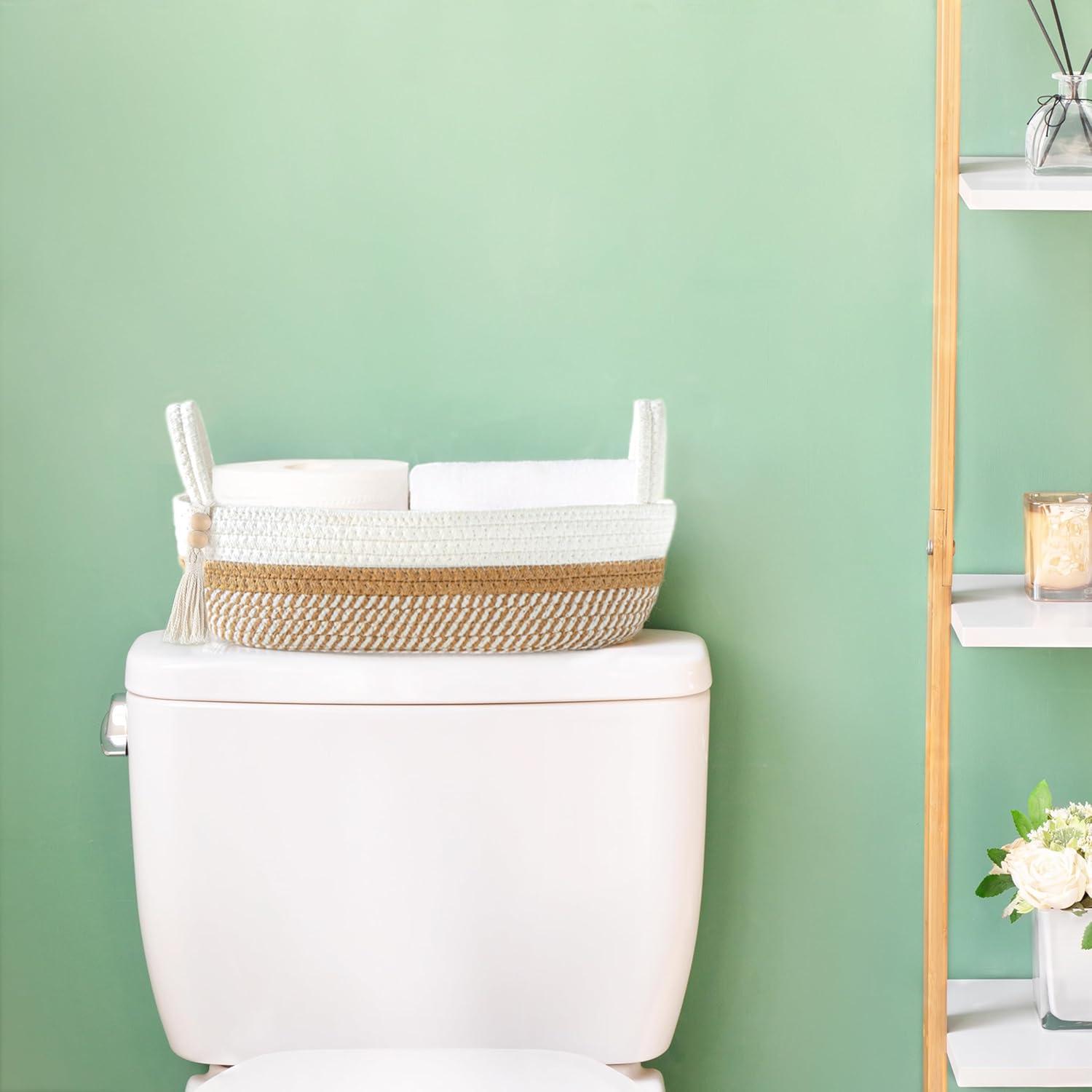 imageMkono Small Storage Basket for Toilet Tank Top Boho Bathroom Decor Woven Rope Toilet Paper Tray Organizer for Shelf Bedroom Living Room White and Brown 13quot L x 6quot WWhite