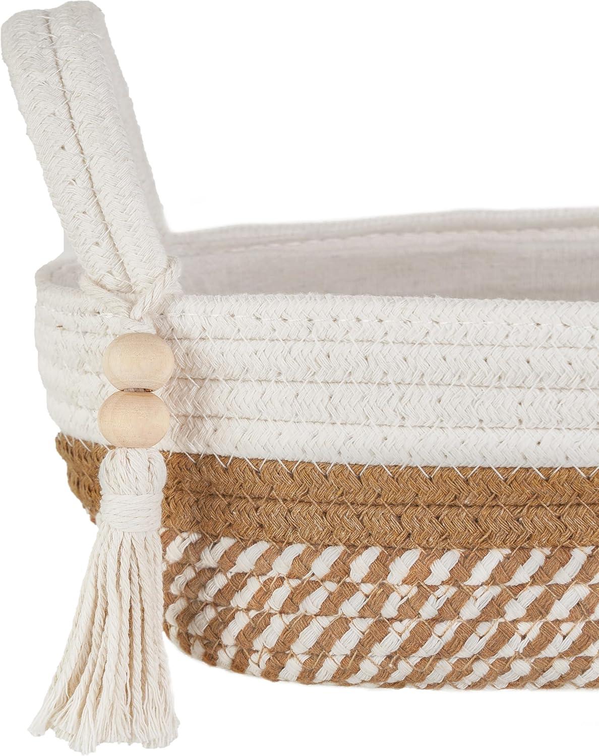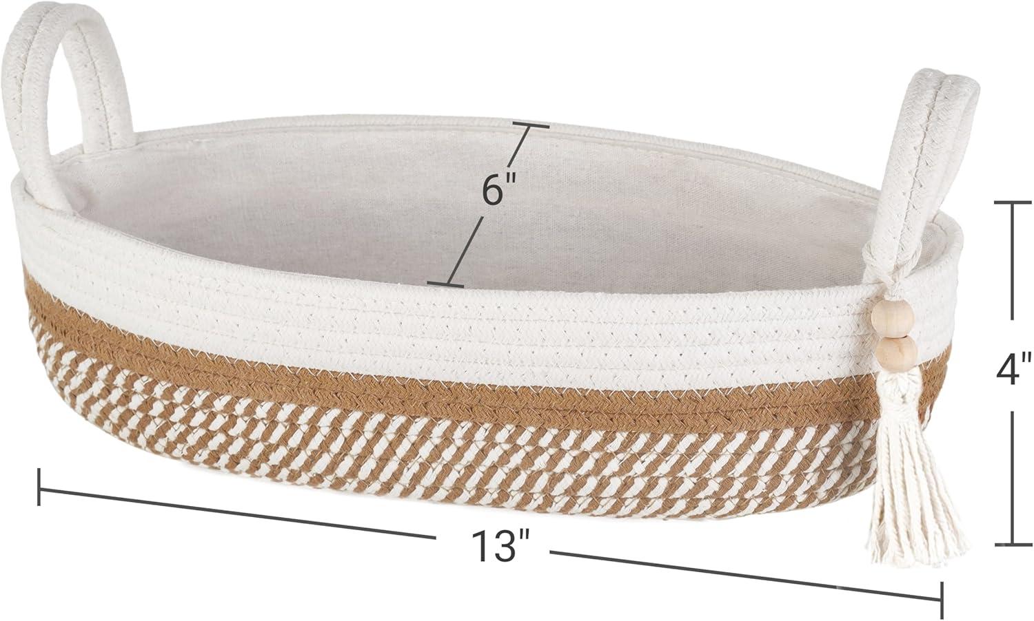 Mkono Small Storage Basket for Toilet Tank Top Boho Bathroom Decor Woven Rope Toilet Paper Tray Organizer for Shelf Bedroom Living Room, White and Brown, 13" L x 6" W(White and Brown)